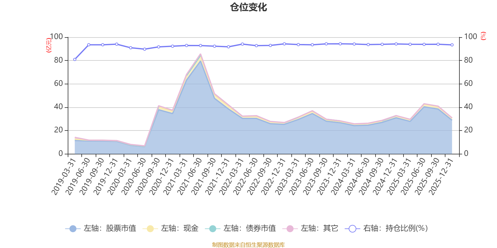 据定期报告数据统计,近三年平均股票仓位为93.92%,同类平均为72.46%。2023年末基金达到94.34%的最高仓位,2019年一季度末最低,为80.96%。