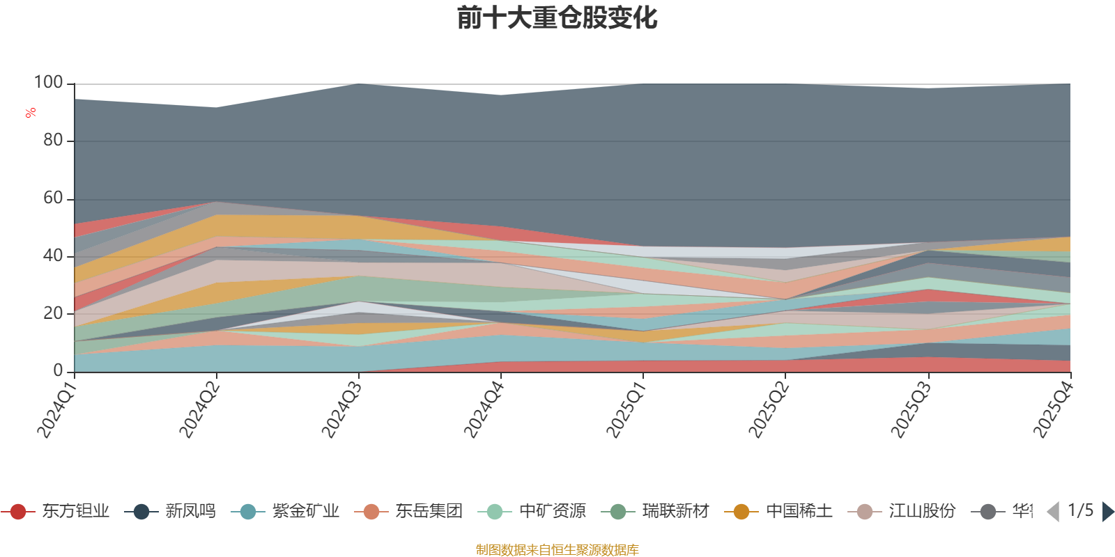 截至2025年四季度末,基金十大重仓股分别是紫金矿业、新凤鸣、万华化学、桐昆股份、洛阳钼业、东岳集团、东方钽业、中矿资源、巨化股份、三美股份。