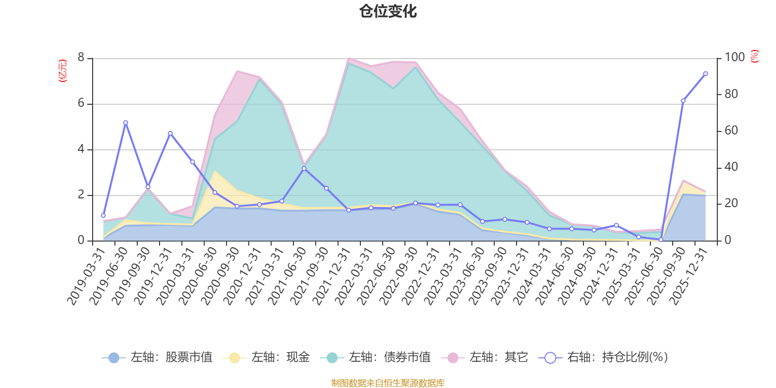 据定期报告数据统计,近三年平均股票仓位为20.91%,同类平均为72.46%。2025年末基金达到91.54%的最高仓位,2025年上半年末最低,为0.62%。