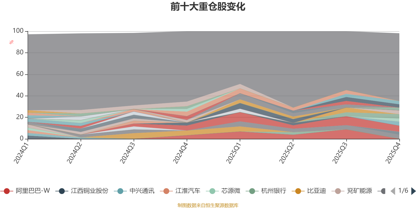 截至2025年四季度末,基金十大重仓股分别是腾讯控股、寒武纪、紫金矿业、天赐材料、中国铝业、洛阳钼业、西部矿业、新易盛、天山铝业、中国平安。