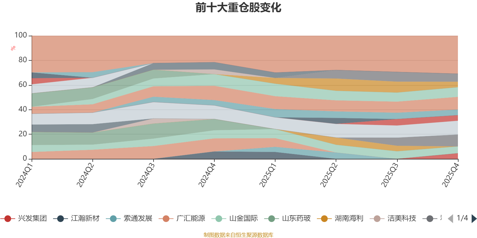 该基金持股集中度较高,近2年前十大重仓股集中度长期超过60%。截至2025年四季度末,基金十大重仓股分别是蓝晓科技、呈和科技、利安隆、确成股份、江山股份、山金国际、赤峰黄金、兴发集团、鲁西化工、振华股份。