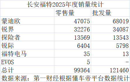 据懂车帝援引的乘联会数据统计,长安福特2025年1~12月在华批发销量12.15万辆,零售销量9.94万辆。这两个数据相比该品牌2024年24.7万辆的销量,均明显腰斩。