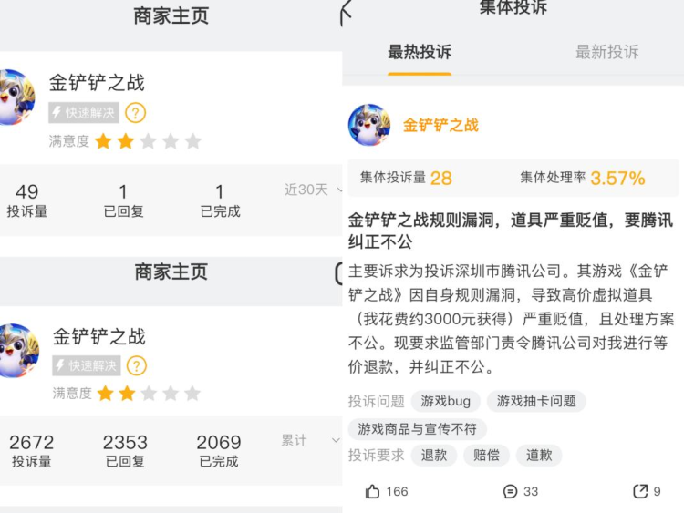 黑猫投诉平台数据显示,“金铲铲之战”相关投诉累计达2671条,其中已回复2353条,近30天内新增投诉48条,回复与完成率偏低。明确指向本次活动存在“游戏bug、抽卡问题、商品与宣传不符、设计漏洞”等问题的集体投诉有28条,集体投诉处理率仅为3.57%,玩家满意度显示为两星。