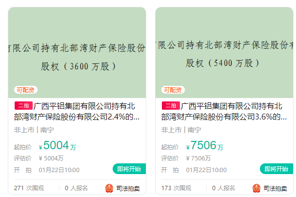 相关信息显示,上述案件涉及执行标的金额约3.55亿元,广西平铝集团为被执行人之一,其所持北部湾财险股权因此被法院列为执行标的。记者注意到,去年底,该笔股权曾进行过首次拍卖,但最终流拍。