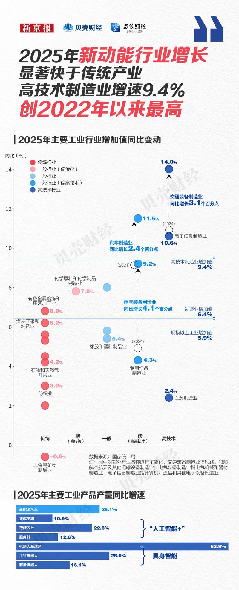 2025年,高技术制造业对全部规模以上工业增长的贡献率达26.1%,“人工智能+”、具身智能等产量迅速增长。