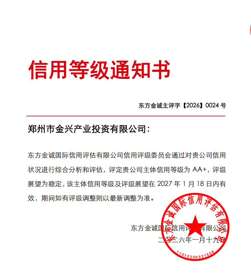 【大河财立方消息】1月19日,郑州市金兴产业投资有限公司正式获得东方金诚国际信用评估有限公司授予的AA+主体信用等级,评级展望为“稳定”。