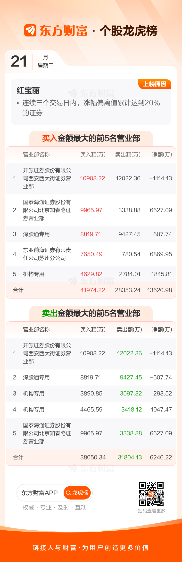 交易所2026年1月21日公布的交易公开信息显示,红宝丽因成为日换手率达到20%的前5只证券、日涨幅偏离值达到7%的前5只证券、连续三个交易日内,涨幅偏离值累计达到20%的证券上榜。红宝丽当日收报9.59元,涨跌幅9.98%,偏离值39.80%,换手率39.79%,成交额27.52亿。异常期间1月20日至1月21日,期间涨幅20.93%,累计偏离值21.13%,区间成交额34.78亿。