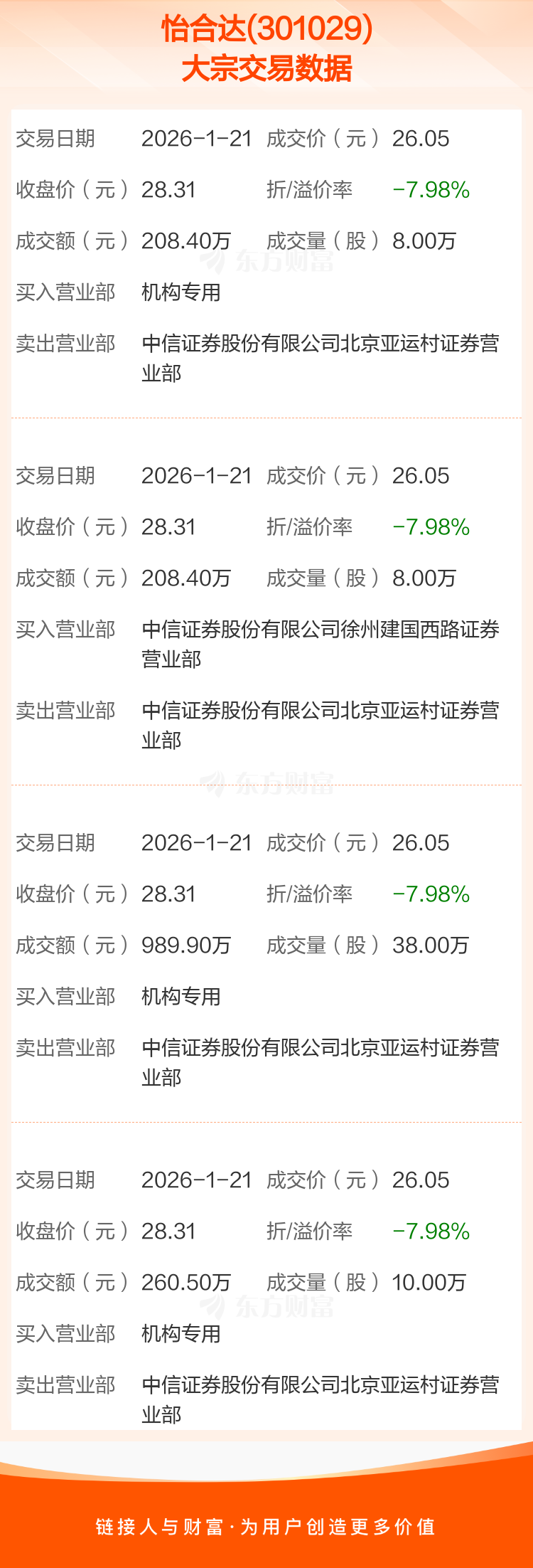2026年1月21日,怡合达发生4笔大宗交易,共成交64.00万股,成交金额1667.20万元,占其流通市值比例为0.13%。
