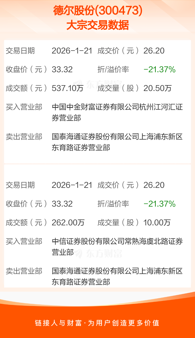 2026年1月21日,德尔股份发生2笔大宗交易,共成交30.50万股,成交金额799.10万元,占其流通市值比例为0.16%。