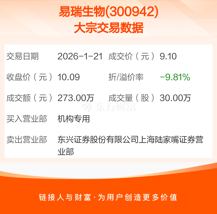 大宗交易:易瑞生物成交273.00万元,折价9.81%(1-21)