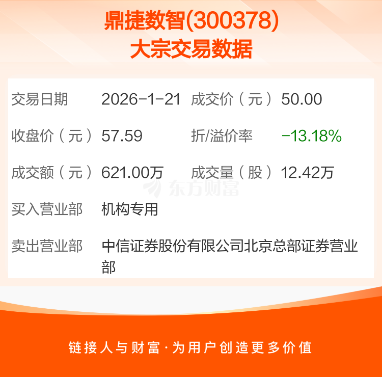 2026年1月21日,鼎捷数智发生1笔大宗交易,共成交12.42万股,成交金额621.00万元,占其流通市值比例为0.04%。
