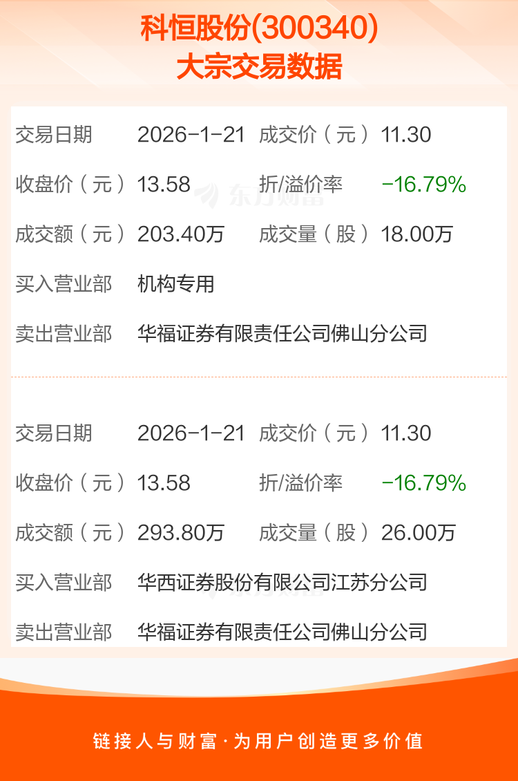 2026年1月21日,科恒股份发生2笔大宗交易,共成交44.00万股,成交金额497.20万元,占其流通市值比例为0.13%。