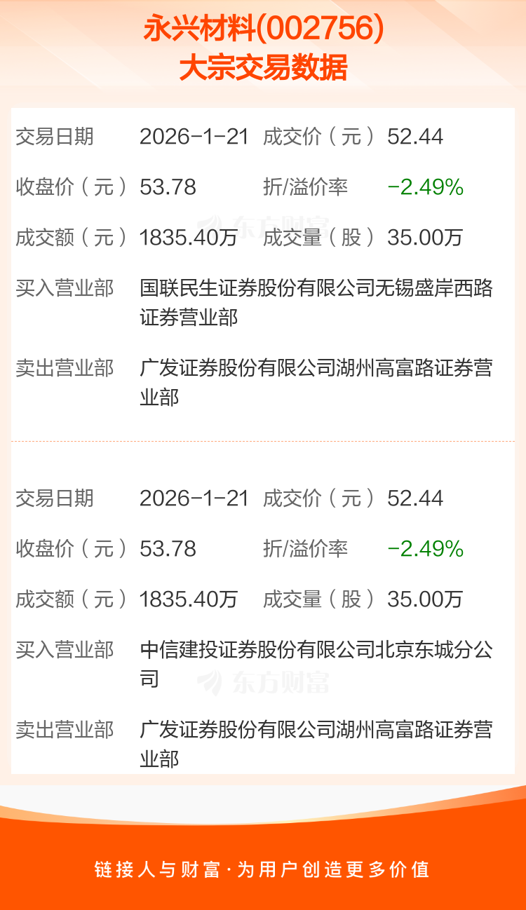 2026年1月21日,永兴材料发生2笔大宗交易,共成交70.00万股,成交金额3670.80万元,占其流通市值比例为0.18%。