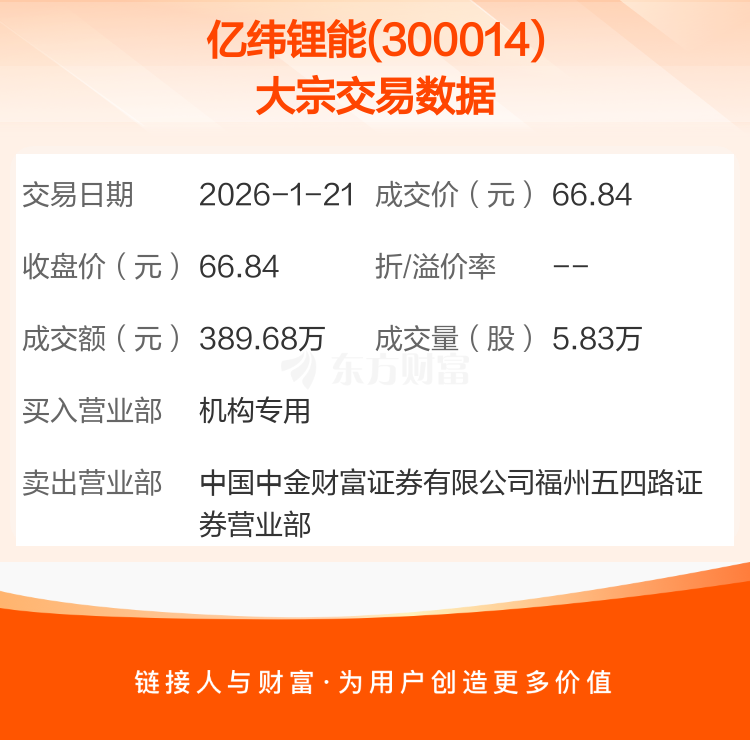 2026年1月21日,亿纬锂能发生1笔大宗交易,共成交5.83万股,成交金额389.68万元。