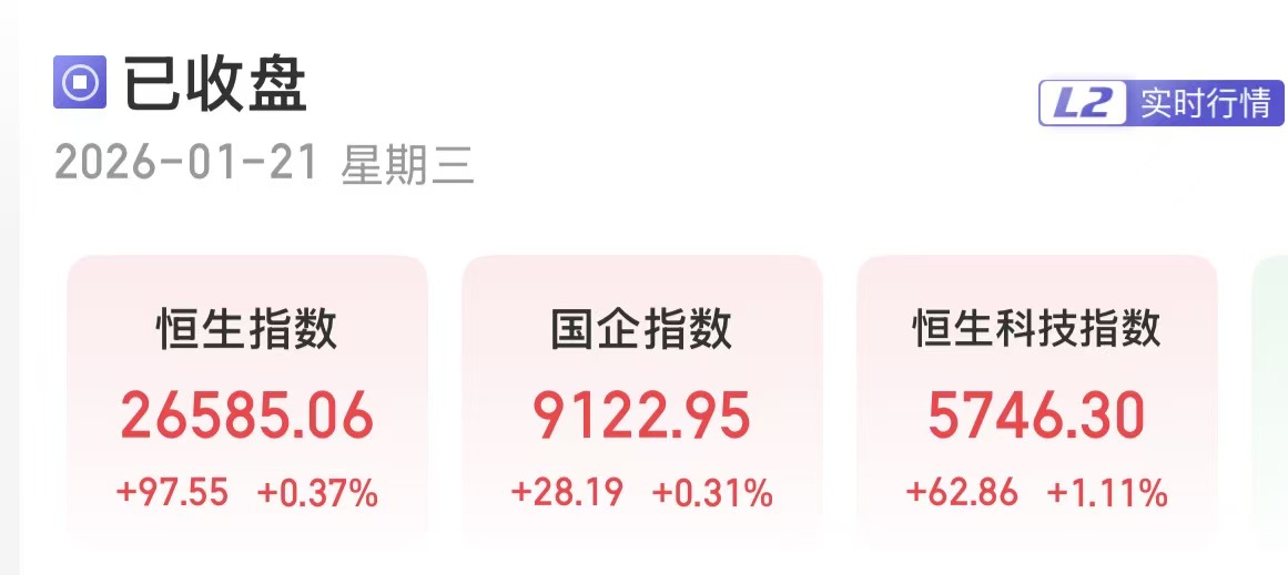 上证报中国证券网讯1月21日,港股三大指数集体收涨。截至收盘,恒生指数涨0.37%,报26585.06点;恒生国企指数涨0.31%,报9122.95点;恒生科技指数涨1.11%,报5746.3点。