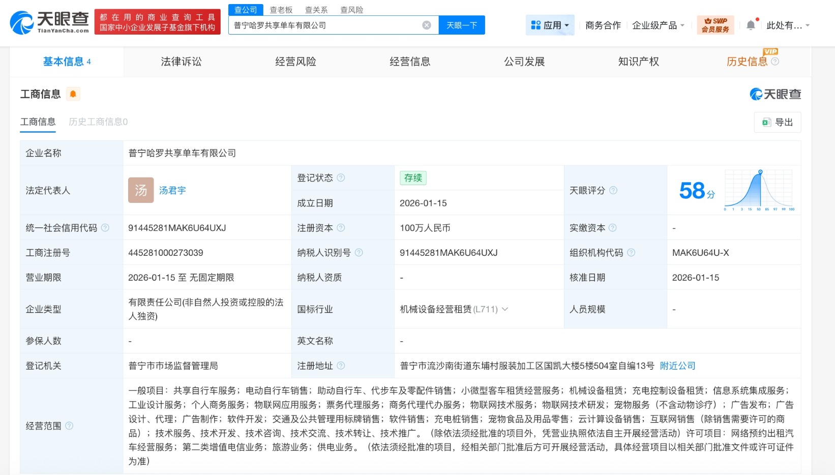 南方财经1月21日电,天眼查工商信息显示,近日,普宁哈罗共享单车有限公司成立,法定代表人为汤君宇,注册资本100万人民币,经营范围含共享自行车服务、电动自行车销售、小微型客车租赁经营服务、个人商务服务、物联网应用服务、票务代理服务、商务代理代办服务等。股东信息显示,该公司由哈啰出行关联公司上海哈啰普惠科技有限公司全资持股。