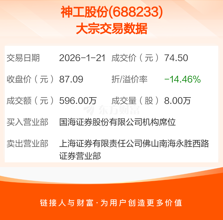 2026年1月21日,神工股份发生1笔大宗交易,共成交8.00万股,成交金额596.00万元,占其流通市值比例为0.04%。