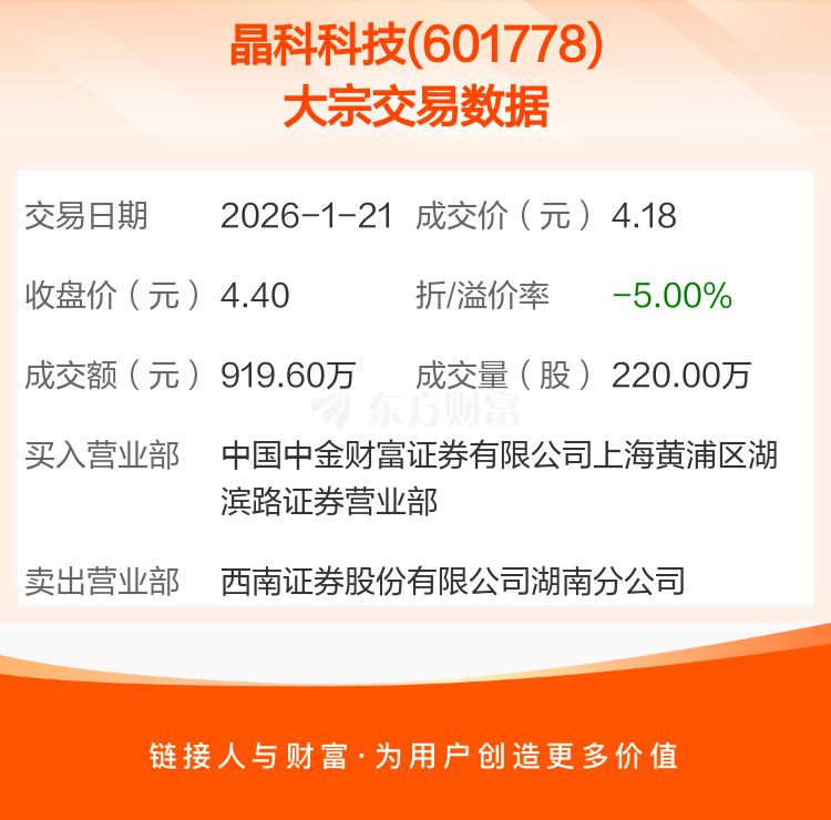 2026年1月21日,晶科科技发生1笔大宗交易,共成交220.00万股,成交金额919.60万元,占其流通市值比例为0.06%。