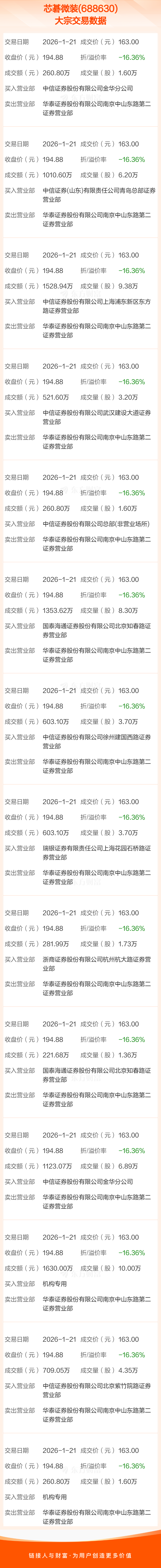 2026年1月21日,芯碁微装发生14笔大宗交易,共成交63.61万股,成交金额1.04亿元,占其流通市值比例为0.40%。
