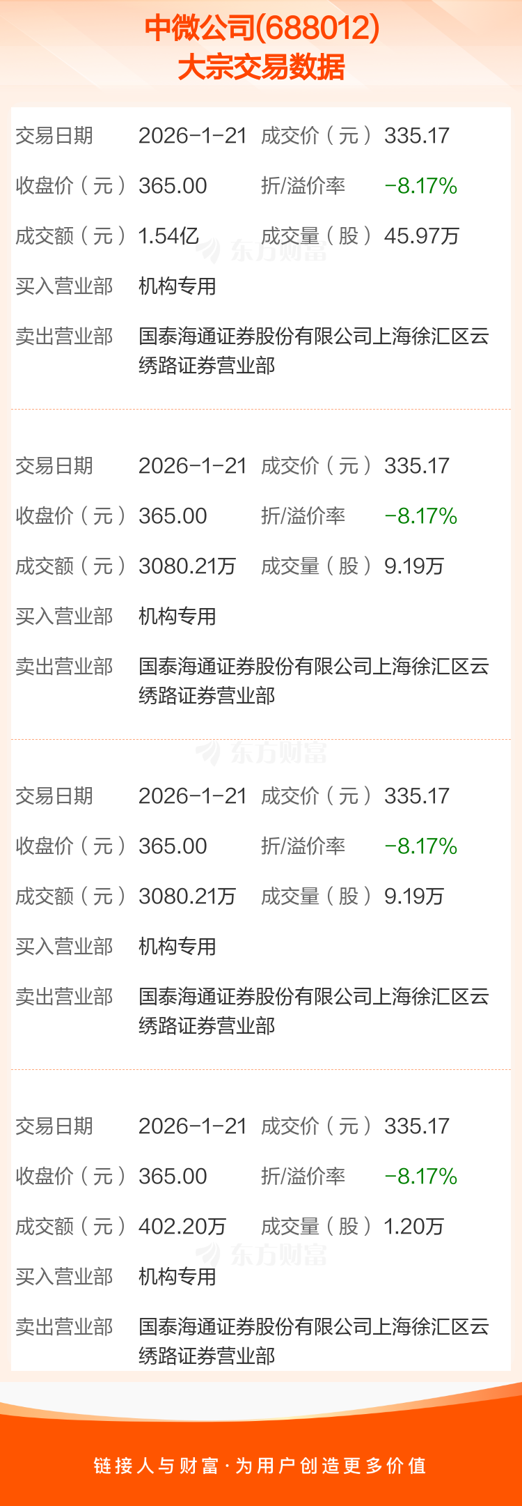 2026年1月21日,中微公司发生4笔大宗交易,共成交65.55万股,成交金额2.20亿元,占其流通市值比例为0.10%。