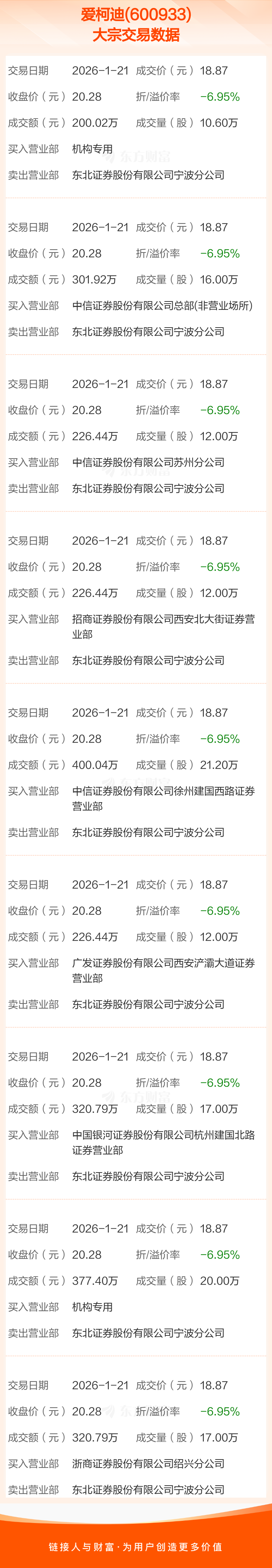 大宗交易:爱柯迪成交2600.28万元,折价6.95%(1-21)