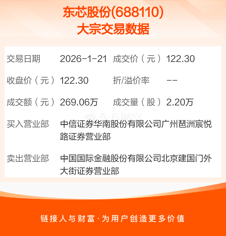 2026年1月21日,东芯股份发生1笔大宗交易,共成交2.20万股,成交金额269.06万元。