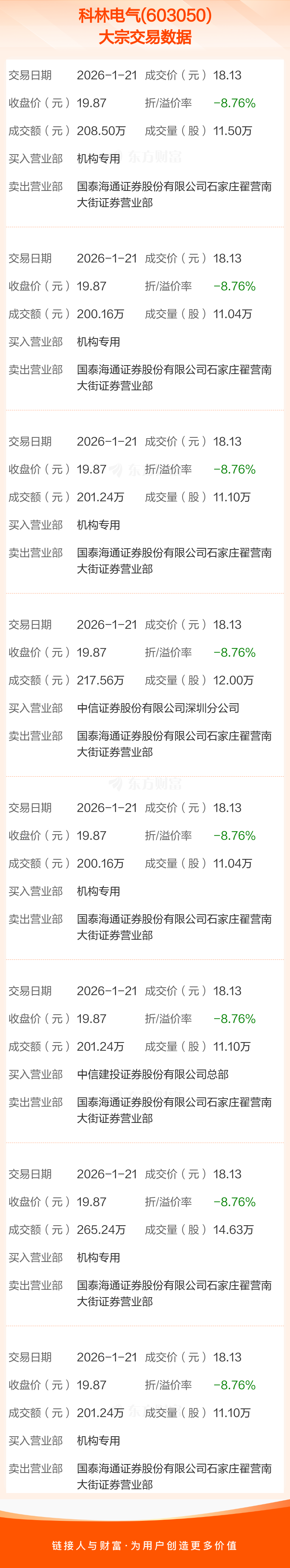 大宗交易:科林电气成交1695.34万元,折价8.76%(1-21)