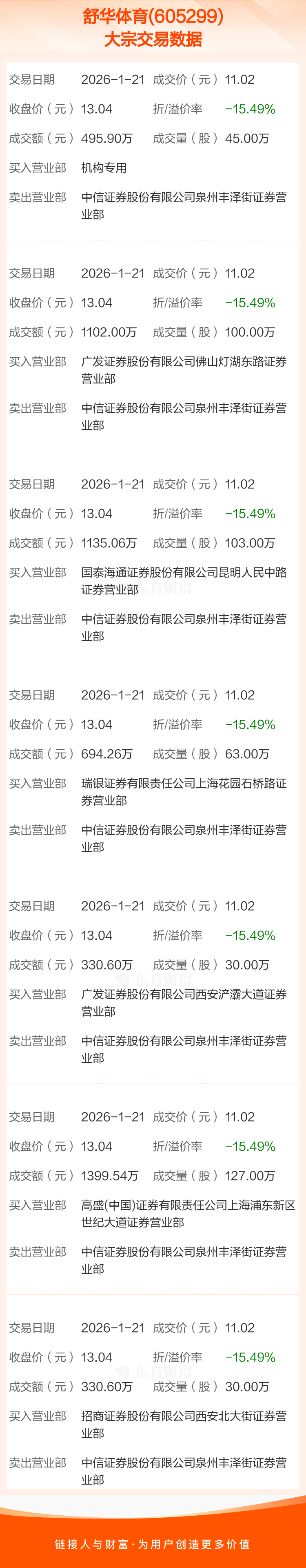 大宗交易:舒华体育成交5487.96万元,折价15.49%(1-21)