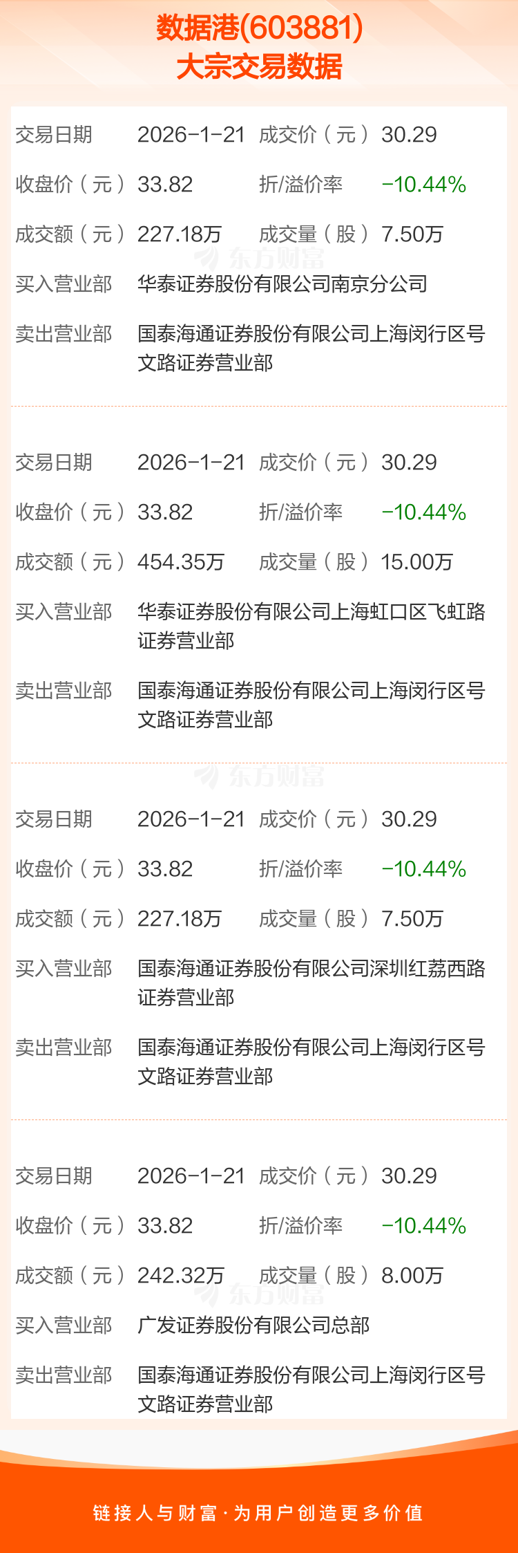 大宗交易:数据港成交1151.03万元,折价10.44%(1-21)