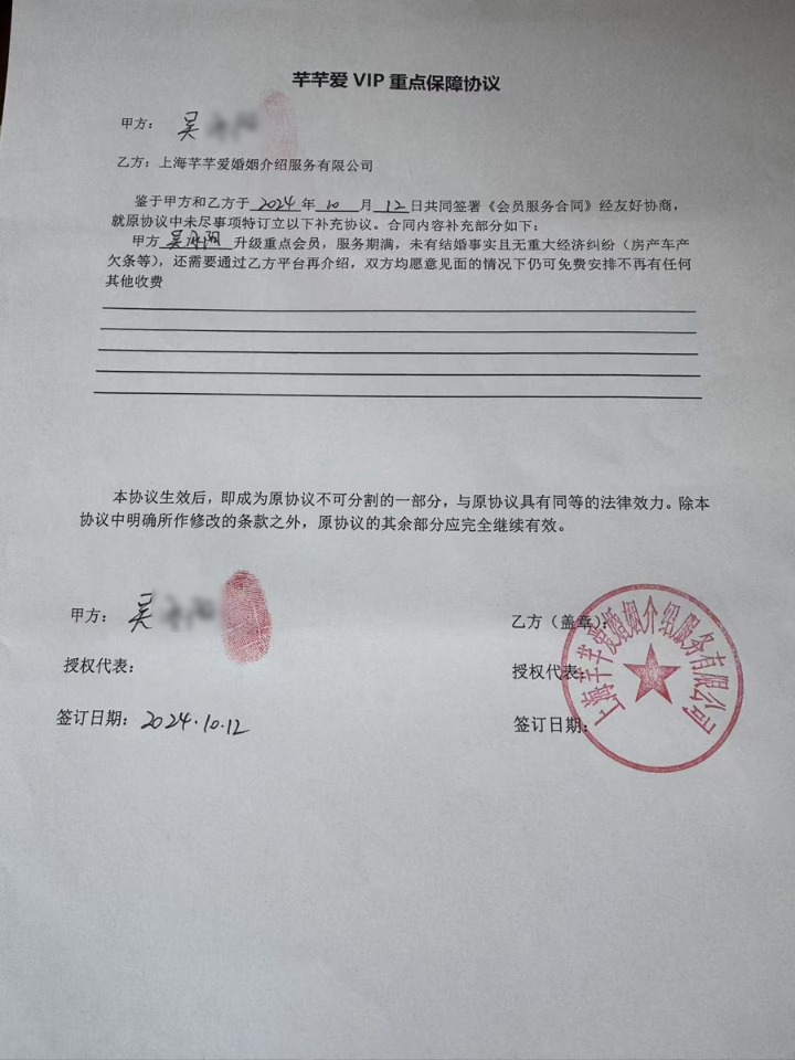 但签约后,红娘推荐的男嘉宾与资料严重不符,“要么学历、工作造假,要么见面后就失联,完全达不到约定的匹配标准。”几个月的相亲无果让张小姐十分焦虑,此时销售人员又推荐了一个所谓的“恋爱专家”项目。联系后,“恋爱专家”迅速开始忽悠“升级套餐”:只要额外支付158700元,就能获取更优质的资源,还有专属老师一对一跟进,成功率翻倍。急于脱单的张小姐又签订补充协议,累计消费达22万多元。