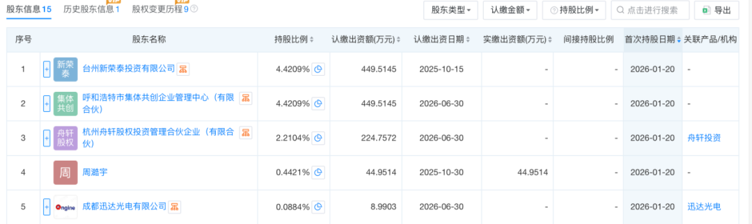 资料显示,新进股东中,杭州舟轩股权投资合伙企业由一米八农业科技董事长胡晓明任执行事务合伙人,台州新荣泰投资有限公司由新荣记创始人张勇全资持股,成都迅达光电有限公司由成都晶华光电科技股份有限公司全资持股。