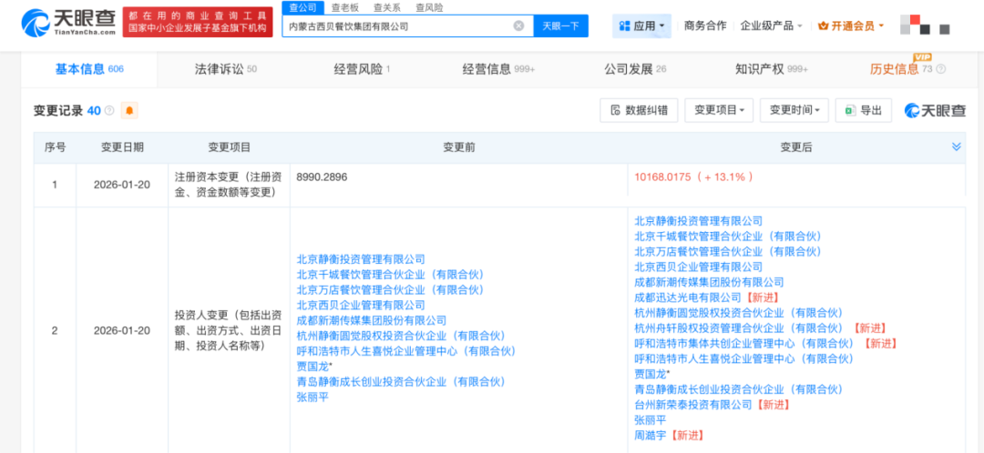 天眼查显示,1月20日,内蒙古西贝餐饮集团有限公司发生工商信息变更,新增台州新荣泰投资有限公司、呼和浩特市集体共创企业管理中心(有限合伙)、杭州舟轩股权投资管理合伙企业(有限合伙)、周澔宇、成都迅达光电有限公司为股东,持股比例分别为4.4209%、4.4209%、2.2104%、0.4421%、0.0884%。