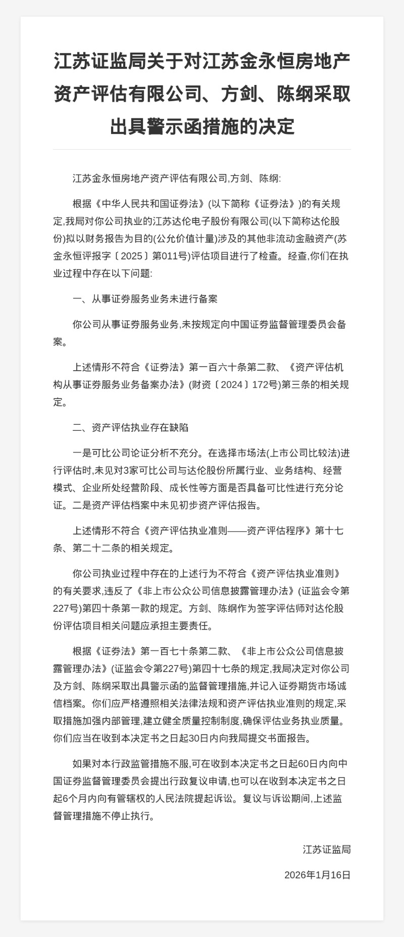 决定书显示,该公司在江苏达伦电子股份有限公司拟以财务报告为目的(公允价值计量)涉及的其他非流动金融资产评估项目执业过程中,存在以下问题:从事证券服务业务未进行备案;资产评估执业存在缺陷:一是可比公司论证分析不充分,二是资产评估档案中未见初步资产评估报告。