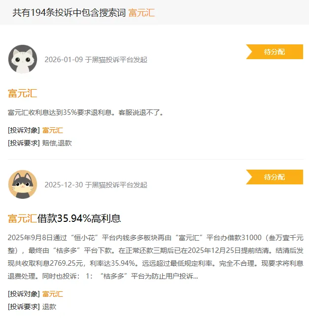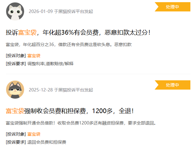 富宝袋为富龙小贷核心贷款品牌,目前在黑猫投诉上投诉量超过3500条,涉年化利率36%、收会员费担保费、暴力催收等。