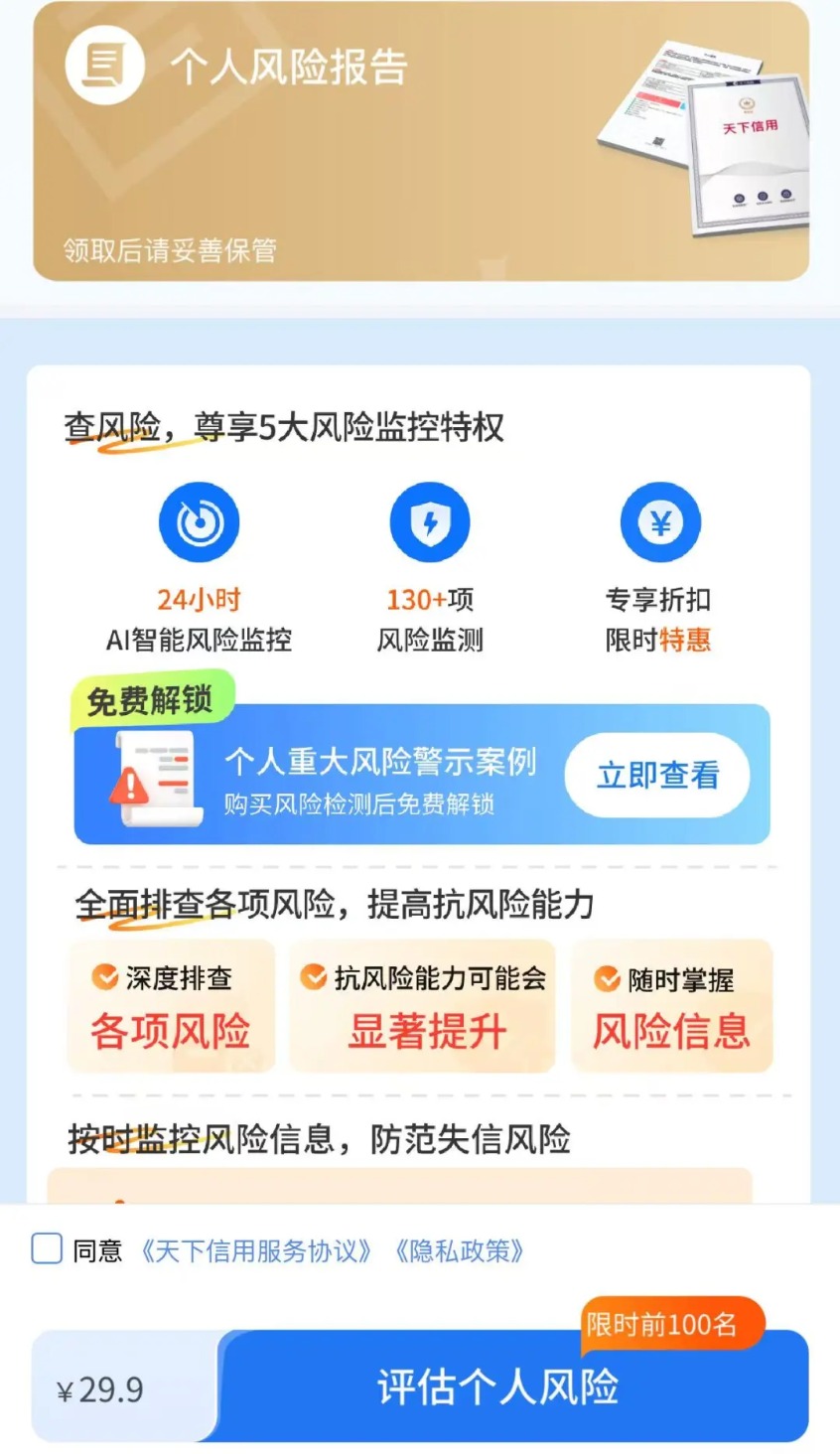 天下信用在富元汇中,在显著位置用个人风险报告等引导用户,疑似打个人征信擦边球。目前涉及个人征信业务的仅有百行征信、朴道征信、钱塘征信三家,天下信用并不在列。
