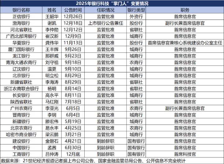 21世纪经济报道记者根据上市公司公告、国家金融监管总局公告以及公开信息不完全统计,2025年共有22家银行科技条线“一把手”发生变更。