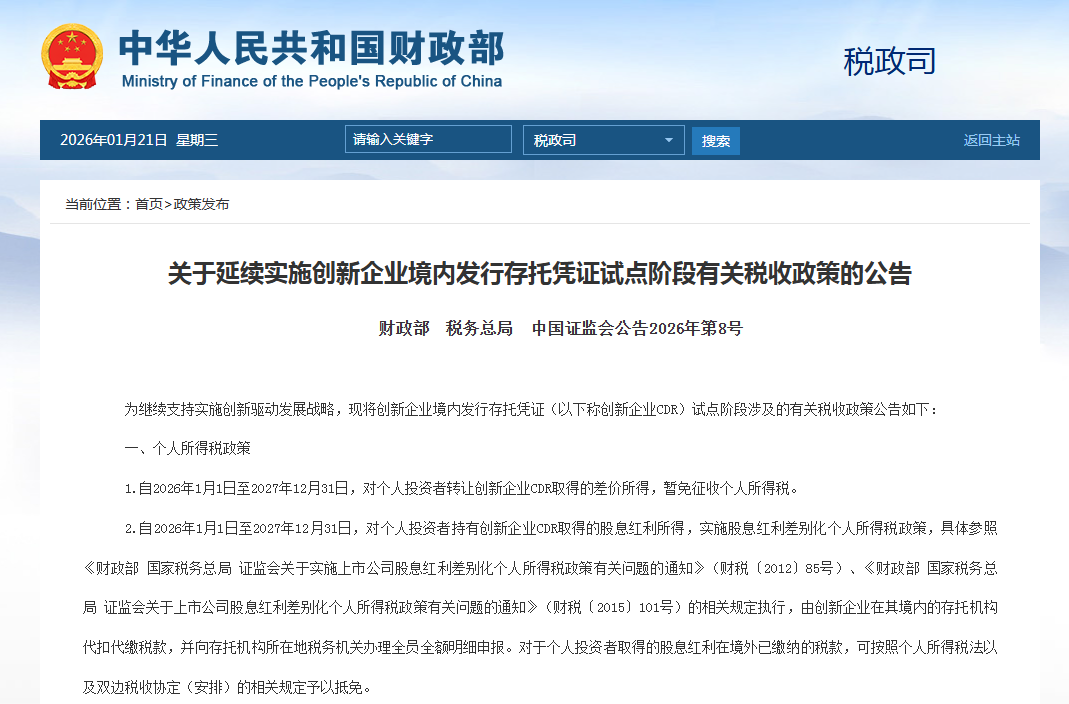 1月21日,财政部、税务总局、中国证监会发布《关于延续实施创新企业境内发行存托凭证试点阶段有关税收政策的公告》。