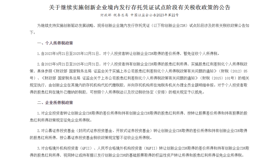 1.自2026年1月1日至2027年12月31日,对个人投资者转让创新企业CDR取得的差价所得,暂免征收个人所得税。
