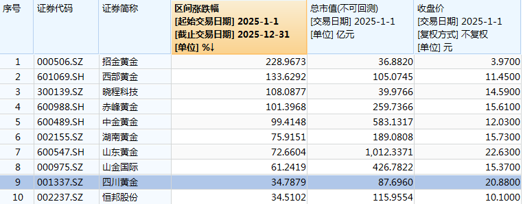 以纳入申万黄金板块的10只成分股为例,2025年涨幅平均数、中位数分别达到95.1%、87.7%,其中半数个股涨幅在100%左右及以上水平,四川黄金同期涨幅排名倒数第二,与倒数第一的恒邦股份基本持平。