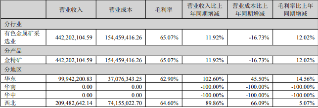 同时,受益于金价的上行与营业成本的下降,公司当期金精矿毛利率提升12个百分点至65.07%。