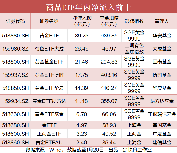 商品型ETF中,规模前十的基金有九只跟踪指数锚定黄金。其中,华安基金的黄金ETF成为境内首只规模突破千亿元的商品ETF;大成基金的有色ETF份额净增长最高,年初以来至1月20日已增长12.51亿份,该基金主要跟踪上期有色金属指数。