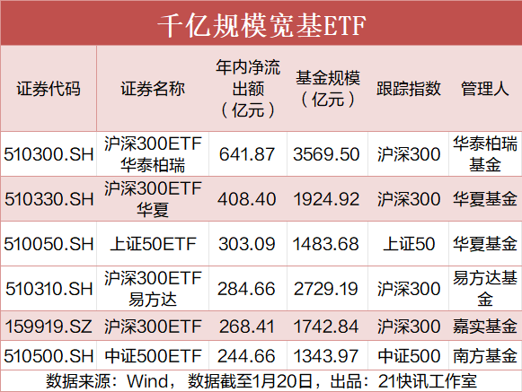 21快讯记者据Wind统计,截至1月20日(下同),市场上的宽基ETF份额已降超1196.28亿份,较年初的9994.58亿份降超11%。受份额赎回影响,易方达的创业板ETF规模跌出“千亿俱乐部”,规模超千亿的宽基ETF已从年初的7只变为6只。其中,华泰柏瑞的沪深300ETF、华夏基金的上证50ETF年内下降份额近乎“百亿”级别,分别为132.96亿份和95.56亿份。