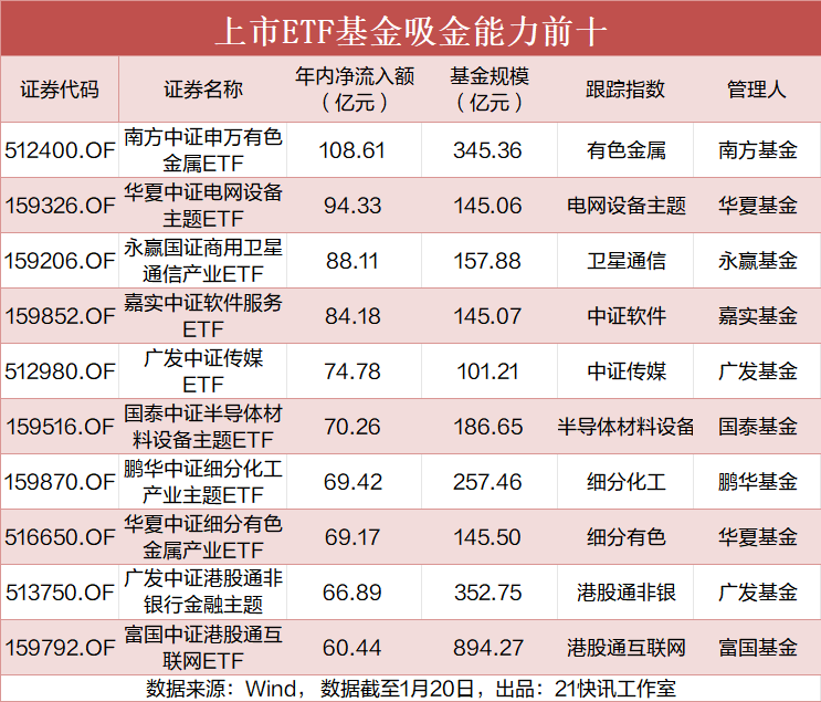 具体来看,有色金属、电网设备以及商用卫星方向ETF基金受到市场热捧,吸金能力惊人。在年内净流入金额排行榜中,南方中证申万有色金属ETF以108.61亿元位居榜首,基金规模为345.36亿元,华夏中证电网设备主题ETF、永赢国证商用卫星通信产业ETF位居第二和第三。