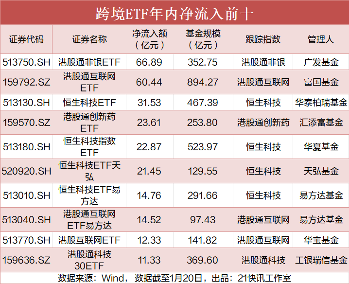 而跨境ETF方面,规模前十的基金有七只跟踪指数锚定港股的科技、互联网指数。其中,富国基金的港股通互联网ETF基金份额涨超66亿份居首。