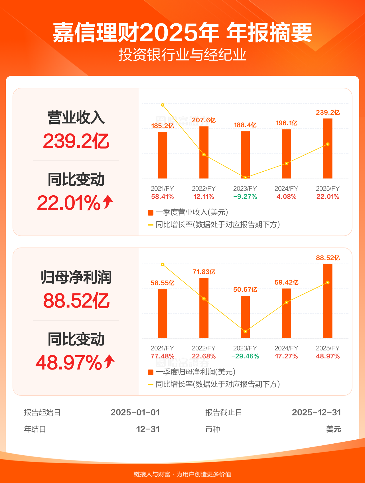 嘉信理财1月21日发布年报业绩,截至2025年12月31日的12个月内,该公司营业收入239.21亿美元,同比增长22.01%;公司权益持有人应占溢利(归母净利润)88.52亿美元,同比增长48.97%。