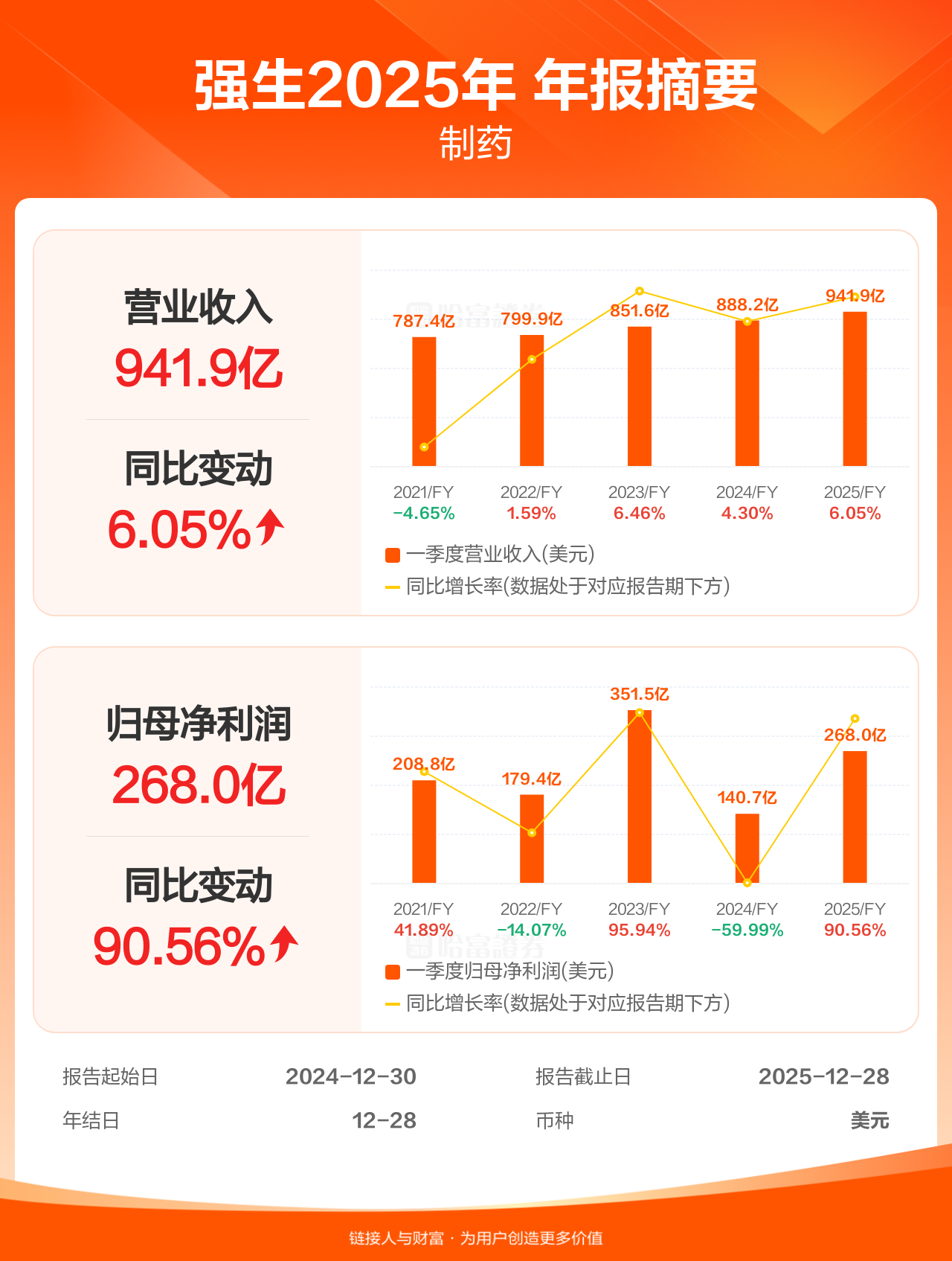 强生1月21日发布年报业绩,截至2025年12月28日的12个月内,该公司营业收入941.93亿美元,同比增长6.05%;公司权益持有人应占溢利(归母净利润)268.04亿美元,同比增长90.56%。