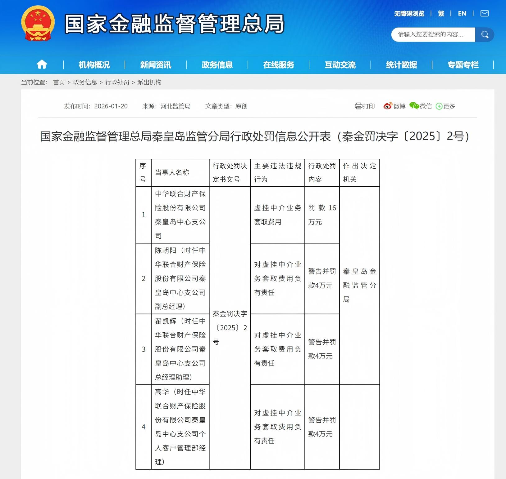 根据公告,中华财险秦皇岛中心支公司因虚挂中介业务套取费用被处以16万元罚款。该公司时任副总经理陈朝阳、时任总经理助理翟凯辉和时任个人客户管理部经理高华均对虚挂中介业务套取费用负有责任,均被秦皇岛金融监管分局警告,各罚款4万元。