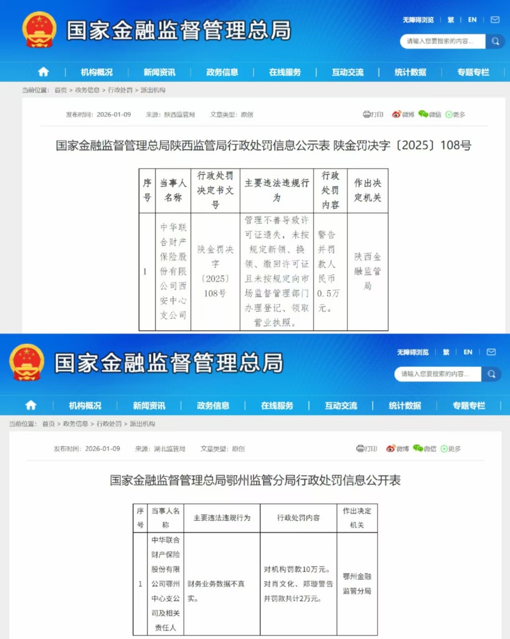 1月9日,因管理不善导致许可证遗失,未按规定新领、换领、缴回许可证且未按规定向市场监督管理部门办理登记、领取营业执照,中华财险西安中心支公司被陕西金融监管局警告,并罚款人民币0.5万元;同日,因财务业务数据不真实,中华财险鄂州中心支公司被鄂州金融监管分局罚款10万元,相关责任人被警告并罚款共计2万元。
