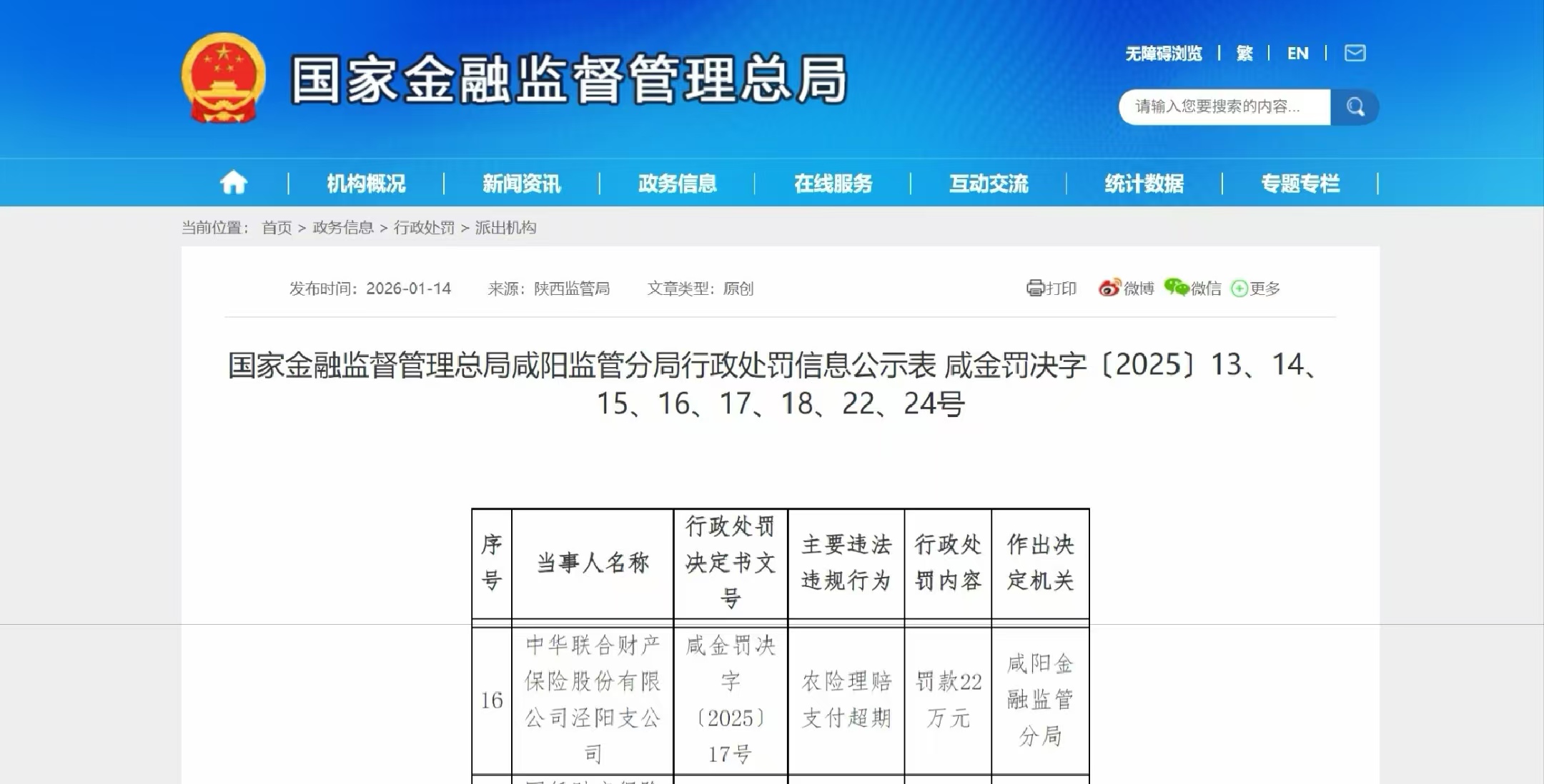 1月16日,因委托未取得合法资格的机构从事保险销售活动、未严格执行经备案的保险条款,九江监管分局责令中华财险九江中心支公司改正,对相关责任人曹志雄给予警告并处2万元罚款;1月14日,因农险理赔支付超期,中华财险泾阳支公司被咸阳金融监管分局罚款22万元。