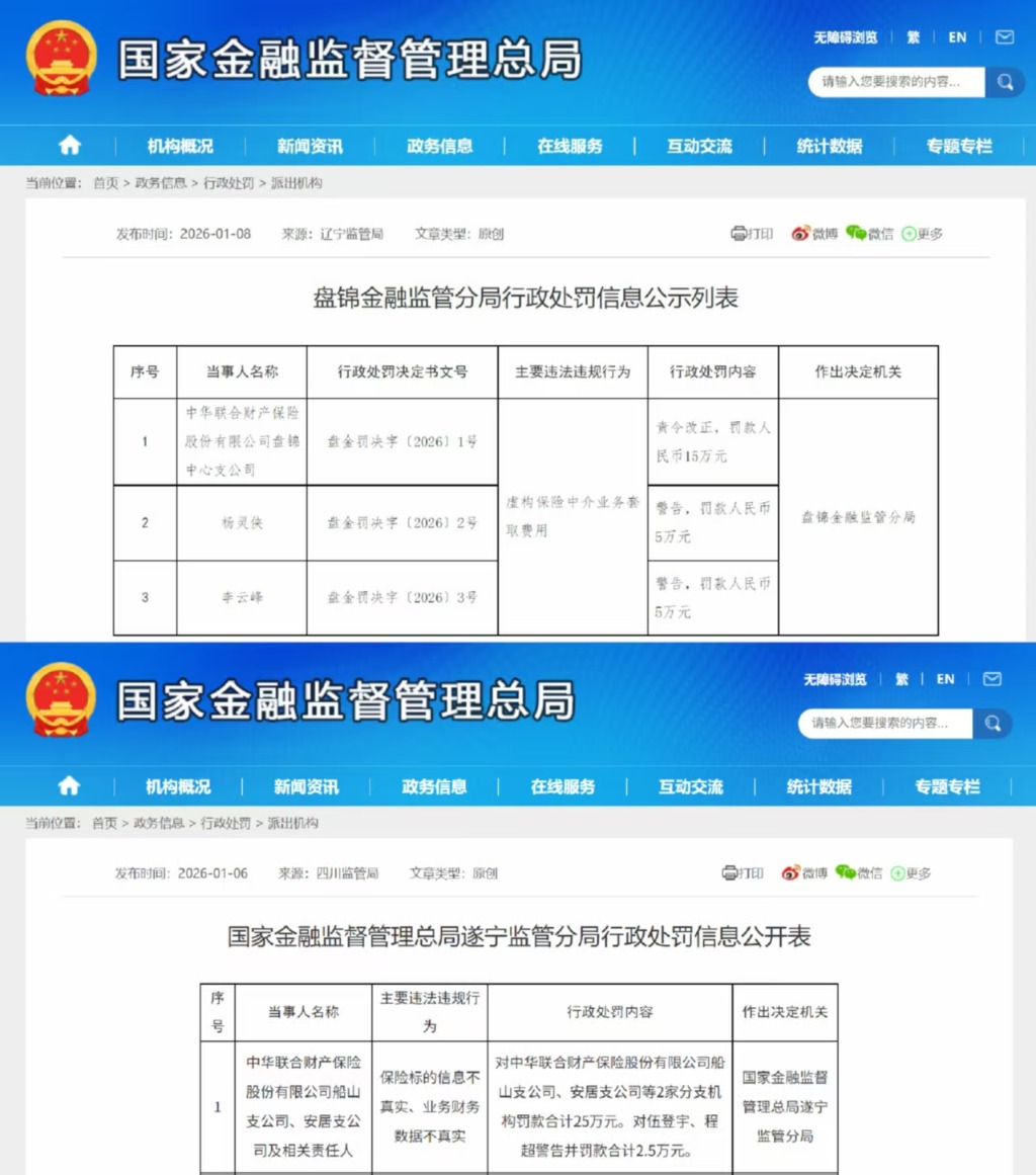 1月8日,因虚构保险中介业务套取费用,中华财险盘锦中心支公司被盘锦金融监管分局责令改正,罚款15万元;2名相关人员均被警告,各罚款5万元。1月6日,因保险标的信息不真实、业务财务数据不真实,中华财险船山支公司、安居支公司两家分支机构被遂宁监管分局合计罚款25万元;对2名相关责任人警告,并合计罚款2.5万元。